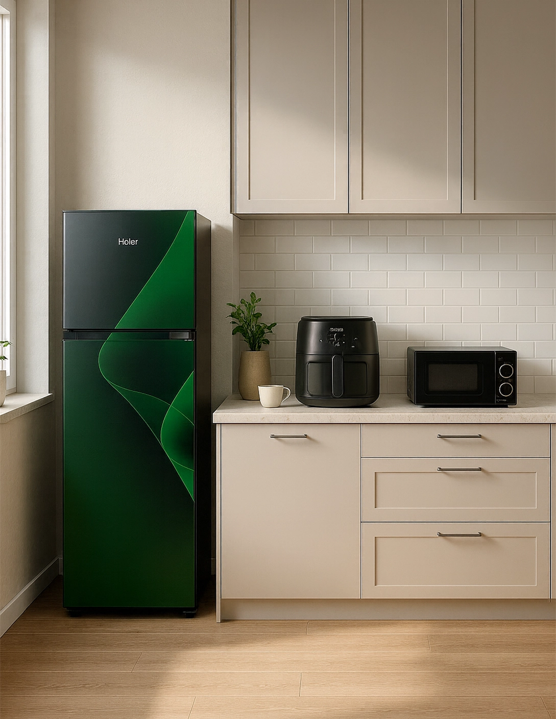 Haier HRF-316 Inverter Refrigerator (316 L) – energy-saving, Turbo Cooling, freshness technology, LED lighting, wide voltage support, and modern double-door design.