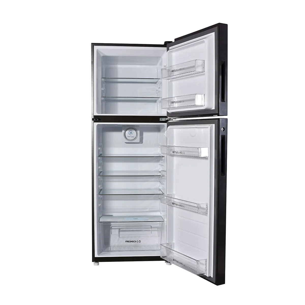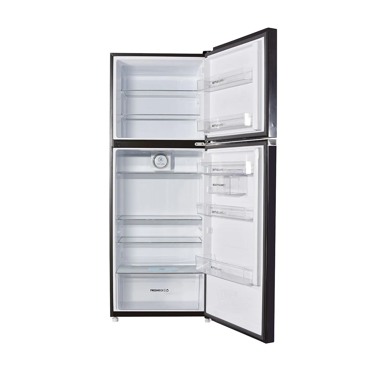 Design Premium double-door design, LED interior lighting, safety glass shelves, spacious door pockets